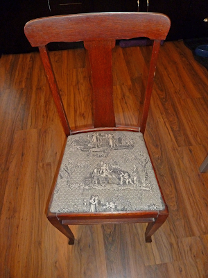 | Dining chairs with original stain, and black and white toile. It lasted a few years but time for a white wash and change of sorts. |