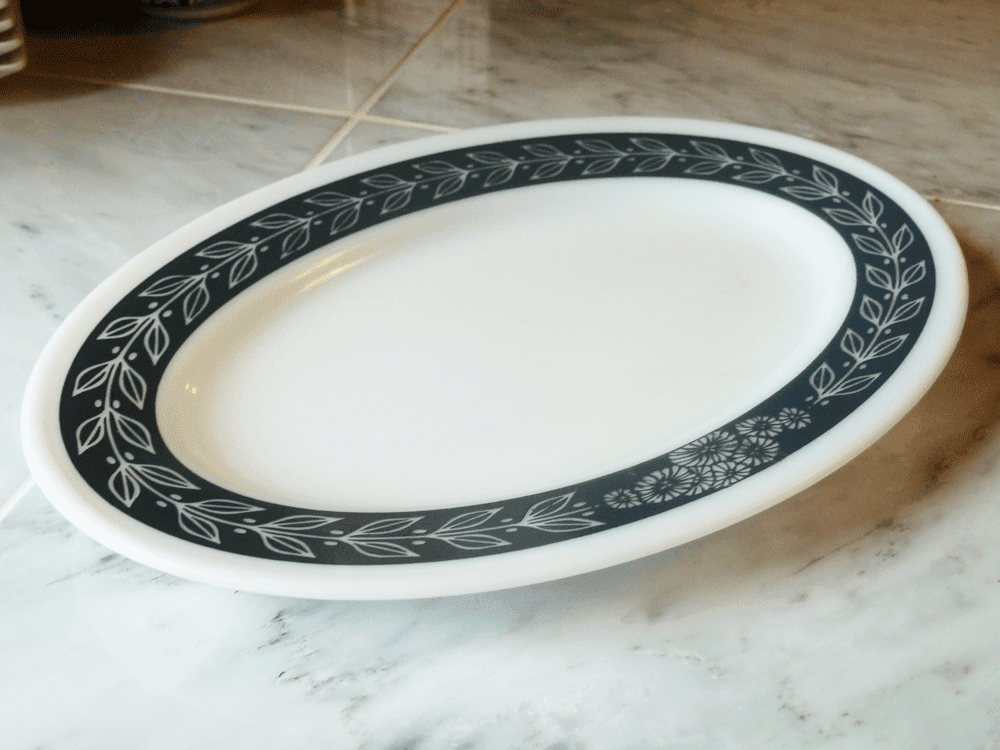I've already used this pretty Pyrex platter for our first tomato slices from the garden. Love the slate trim with white leaves and flowers.